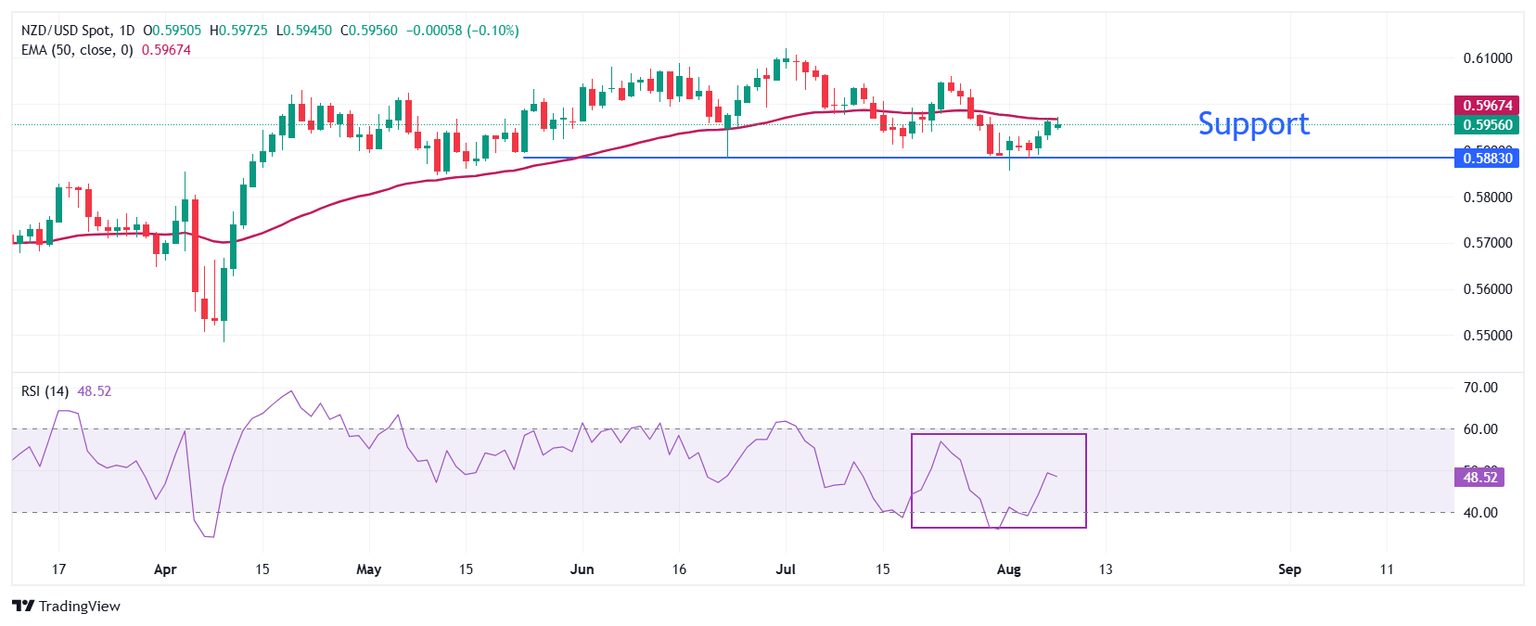 El NZD/USD intenta extender su recuperación por encima de la Media Móvil Exponencial (EMA) de 50 días, que cotiza alrededor de 0.5967.