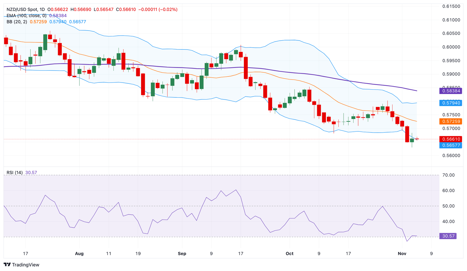 Técnicamente, el NZD/USD mantiene la perspectiva negativa en el gráfico diario, con el precio sosteniéndose por debajo de la media móvil exponencial (EMA) clave de 100 días. El camino de menor resistencia es a la baja, ya que el Índice de Fuerza Relativa (RSI) de 14 días se sitúa por debajo de la línea media cerca de 31.15. Esto sugiere un impulso bajista en el corto plazo.