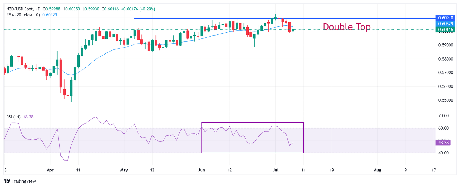 El NZD/USD disminuye drásticamente después de enfrentar una fuerte presión de venta cerca de la resistencia crítica alrededor del máximo del 16 de junio en 0.6090, formando un patrón gráfico de Doble Techo. El par lucha por regresar por encima de la media móvil exponencial (EMA) de 20 días alrededor de 0.6033, lo que sugiere una tendencia bajista a corto plazo.