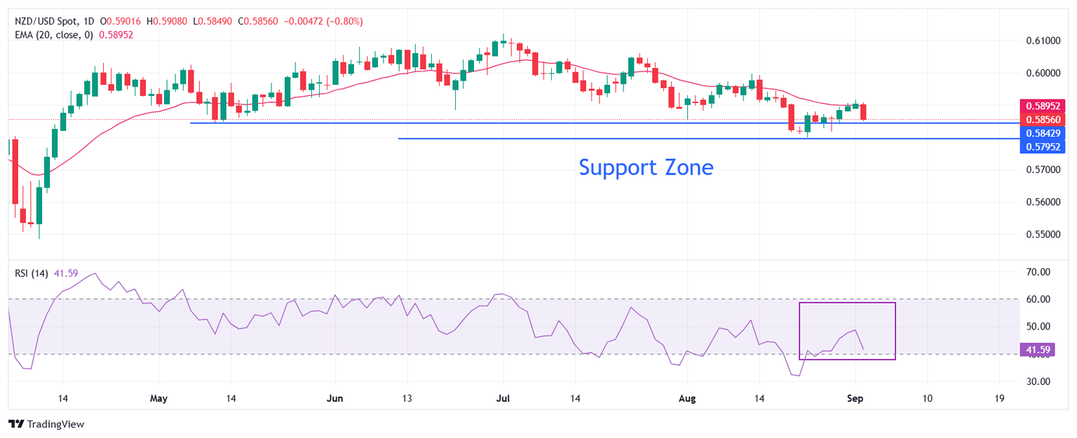 Pronóstico del NZD/USD: Desplomándose cerca de 0.5850 mientras la EMA de 20 días sigue siendo la barrera clave