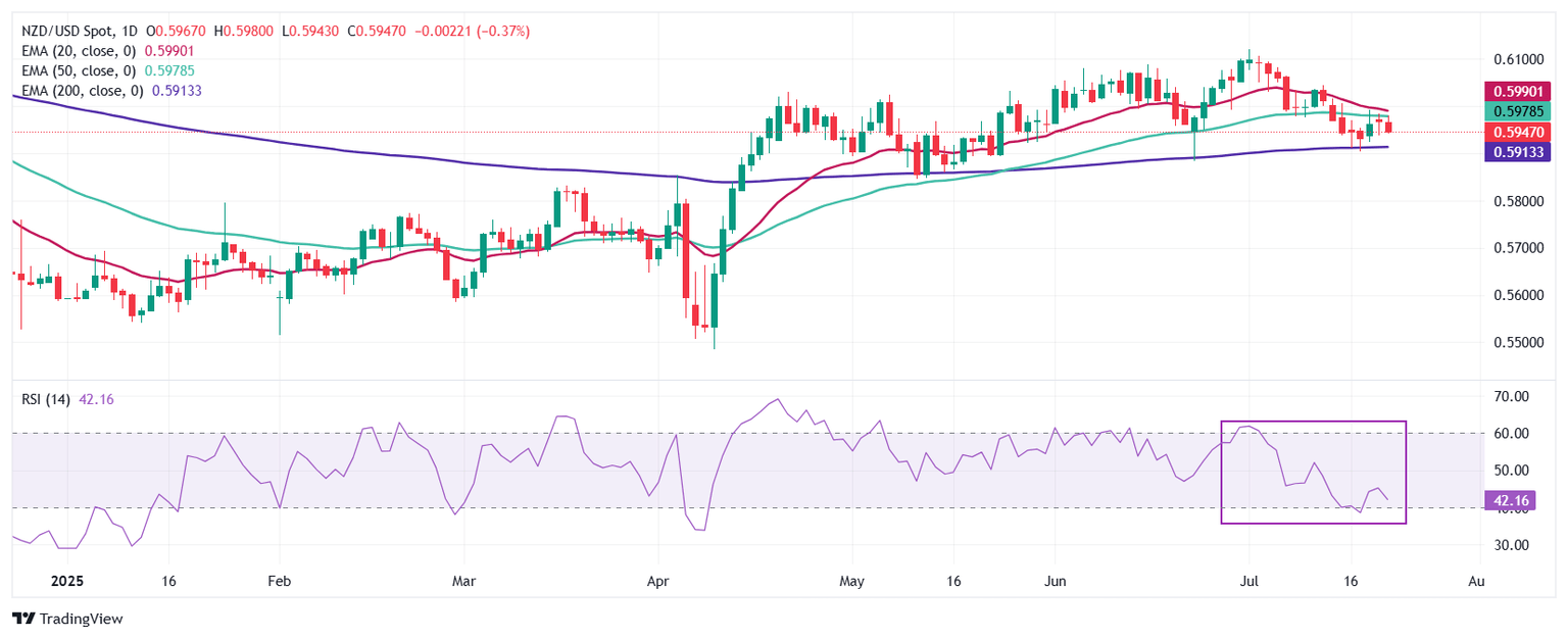 El NZD/USD continúa manteniendo la Media Móvil Exponencial (EMA) de 200 días, que está alrededor de 0.5910. Sin embargo, la tendencia general sigue siendo bajista ya que las EMAs de 20 y 50 días tienen una pendiente descendente.