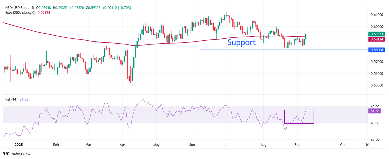 El NZD/USD extiende su tendencia alcista por encima de la Media Móvil Exponencial (EMA) de 200 días, que cotiza alrededor de 0.5912.