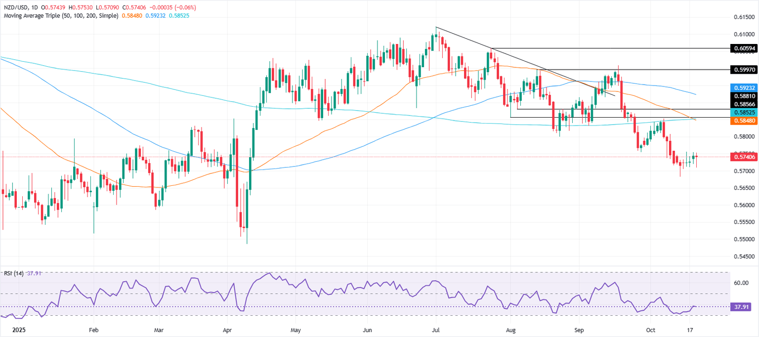 La imagen técnica del NZD/USD revela que el par se está consolidando alrededor de 0.5700-0.5760. El índice de fuerza relativa (RSI), aunque bajista, se mantiene estable, lo que indica que ni los compradores ni los vendedores tienen el control.