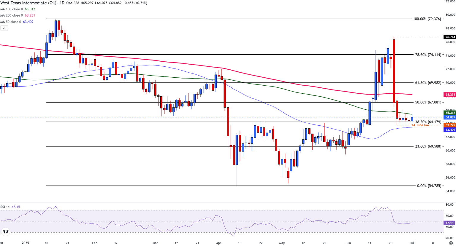 - Las ganancias del petróleo crudo WTI están restringidas por la media móvil de 100 días, proporcionando resistencia adicional en 65.31$.
