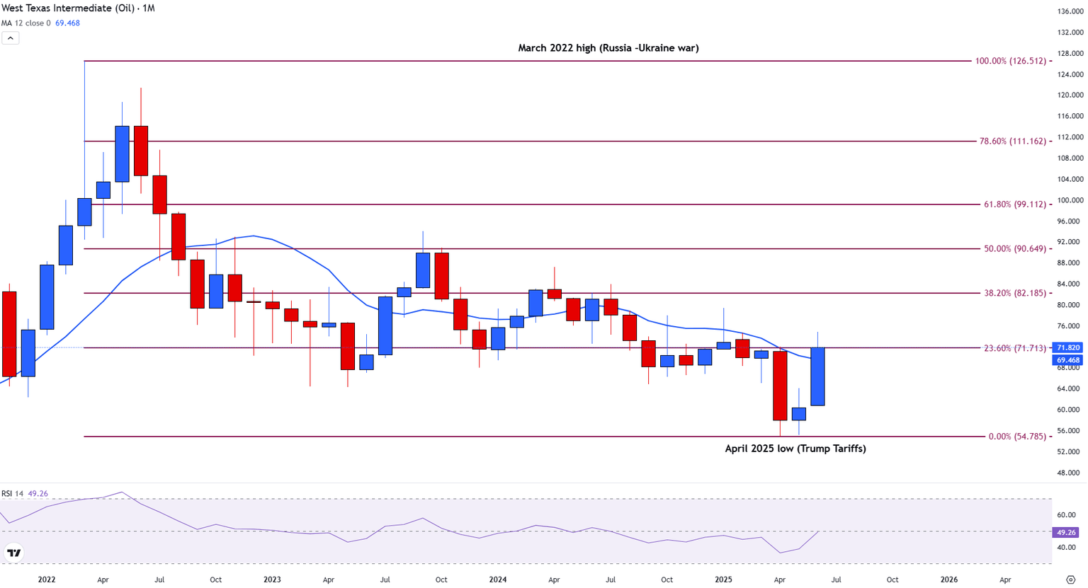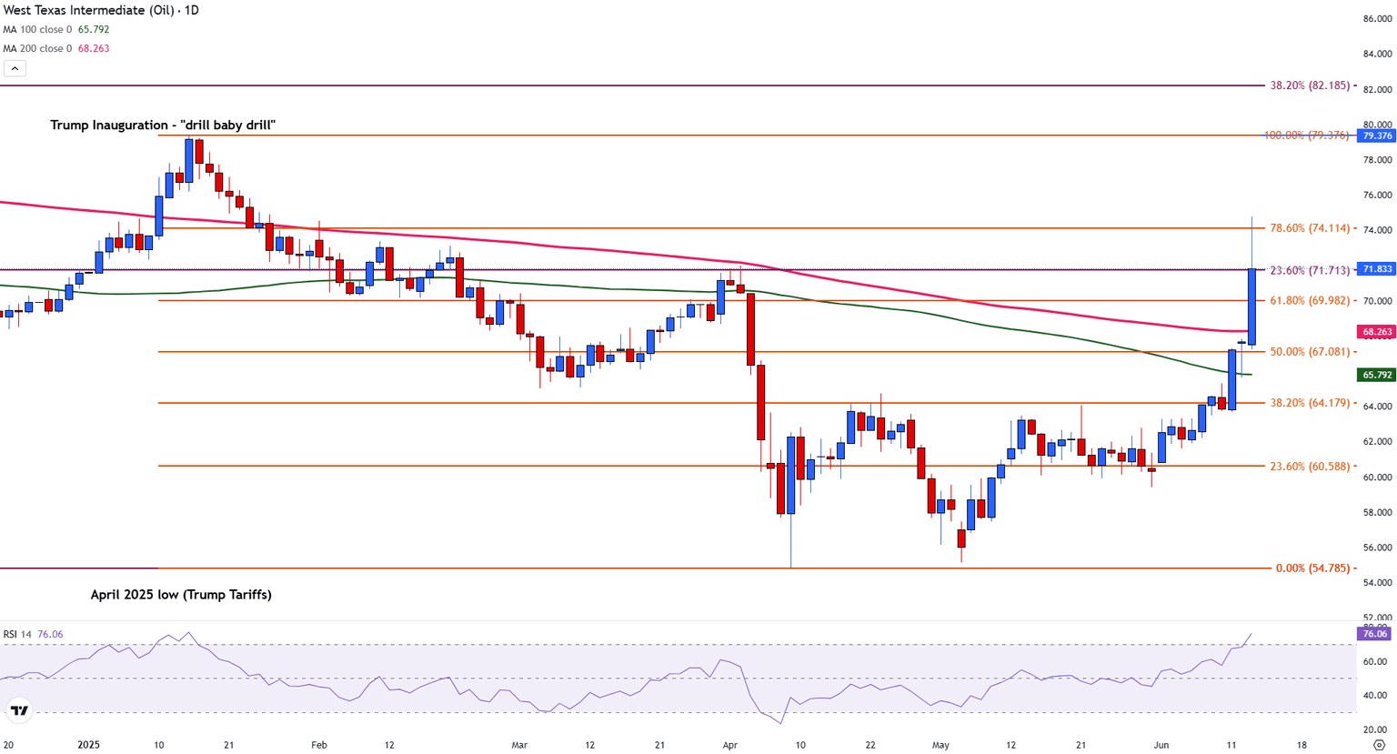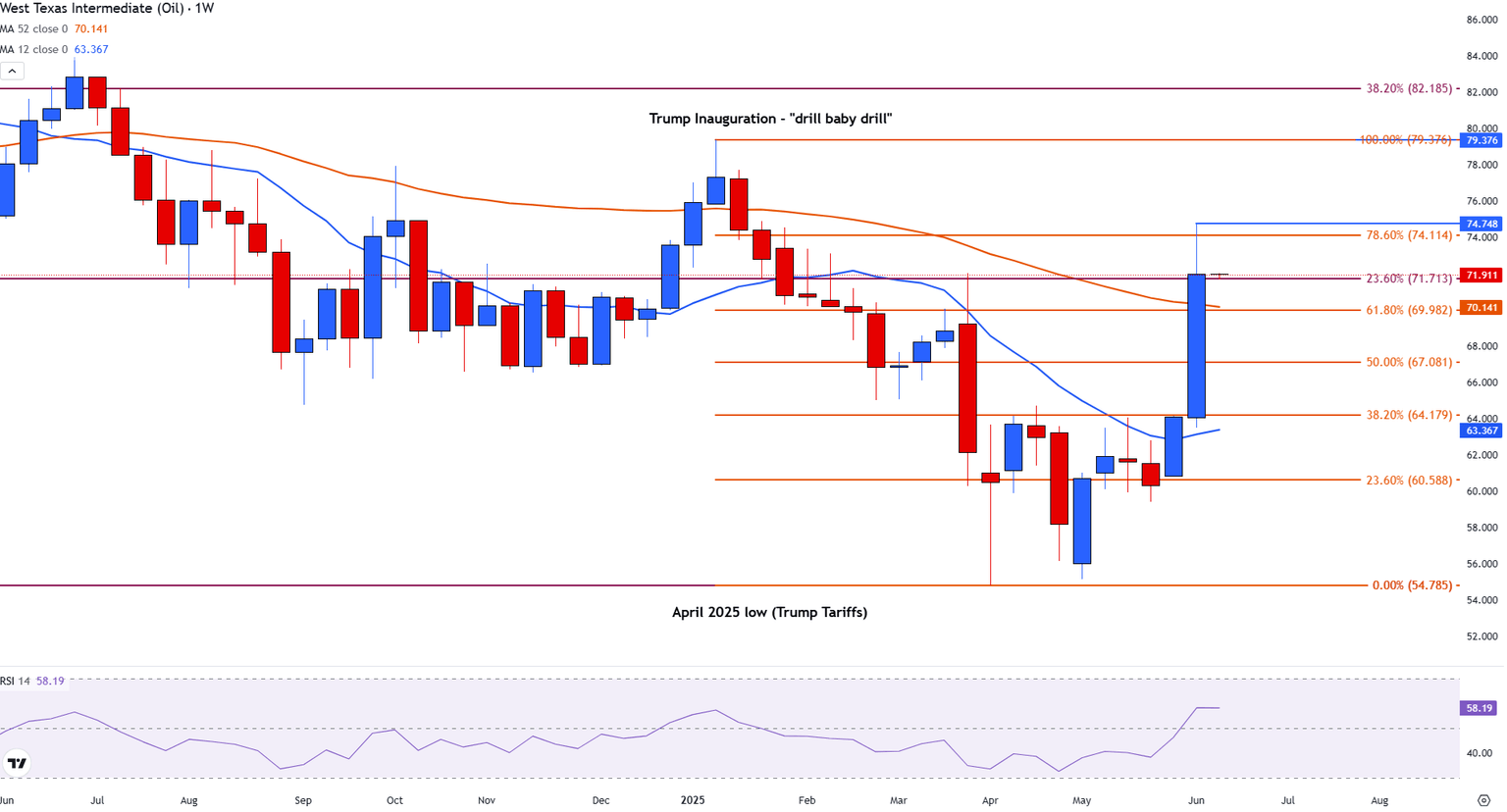 El petróleo crudo WTI se está disparando en medio de la escalada de tensiones geopolíticas, con los recientes ataques de Israel a Irán alimentando una recuperación que empujó los precios por encima de la zona de 74.00$ el viernes. En el momento de escribir, el WTI se cotiza justo por debajo de 72.00$ después de que Irán respondiera con su propio bombardeo de misiles, marcando una ganancia cercana al 20% para junio y revirtiendo gran parte de la debilidad observada a principios de este año.