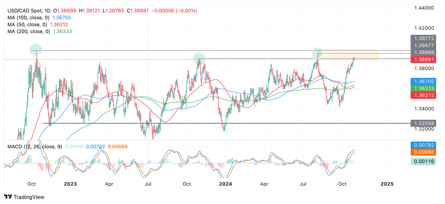 El USD/CAD ha alcanzado una zona (rectángulo sombreado en naranja) en los 1.3800s y 1.3900s compuesta de resistencia desde máximos históricos. Estos incluyen el máximo de agosto de 2024, el máximo de noviembre de 2023 y el máximo de octubre de 2022. Los picos han sido resaltados con círculos azules en el gráfico anterior. Comprenden la parte superior del rango lateral a largo plazo del par.