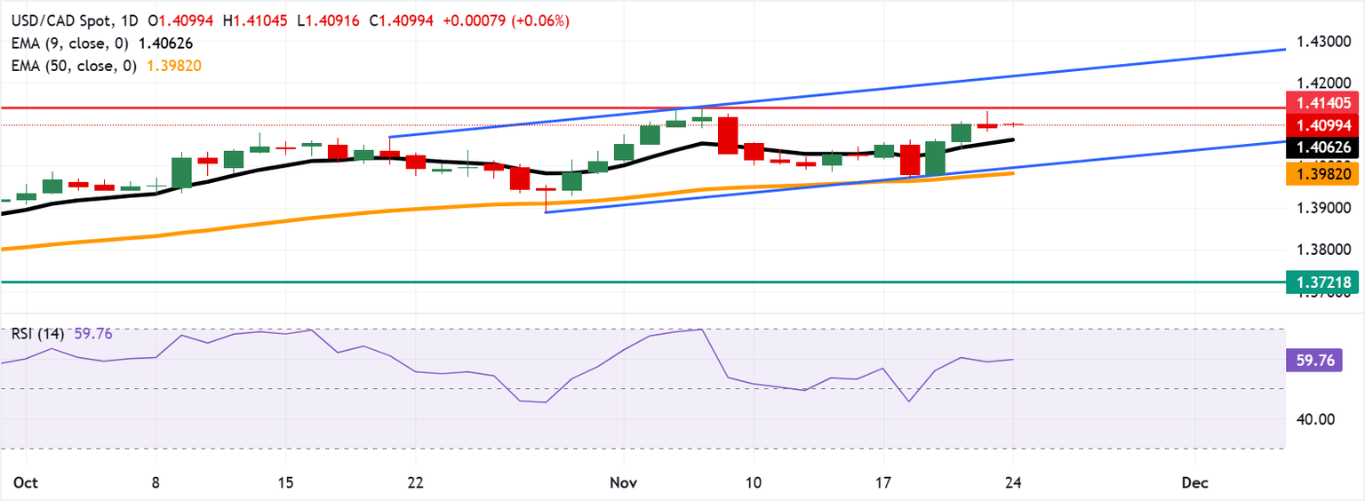 El USD/CAD recupera sus recientes pérdidas de la sesión anterior, cotizando alrededor de 1.4100 durante las primeras horas europeas del lunes. La configuración técnica del gráfico diario refleja un sesgo alcista persistente, con el par manteniéndose dentro de su patrón de canal ascendente. El Índice de Fuerza Relativa (RSI) de 14 días tiende al alza cerca de 59.9, permaneciendo por encima de la línea media, confirmando el impulso alcista.