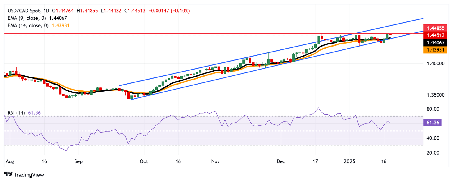 El par USD/CAD termina su racha de dos días de ganancias, cotizando cerca de 1.4450 durante la sesión europea del lunes. Desde un punto de vista técnico, el gráfico diario sugiere que el par cotiza dentro de un canal ascendente, lo que indica un sesgo alcista continuo.