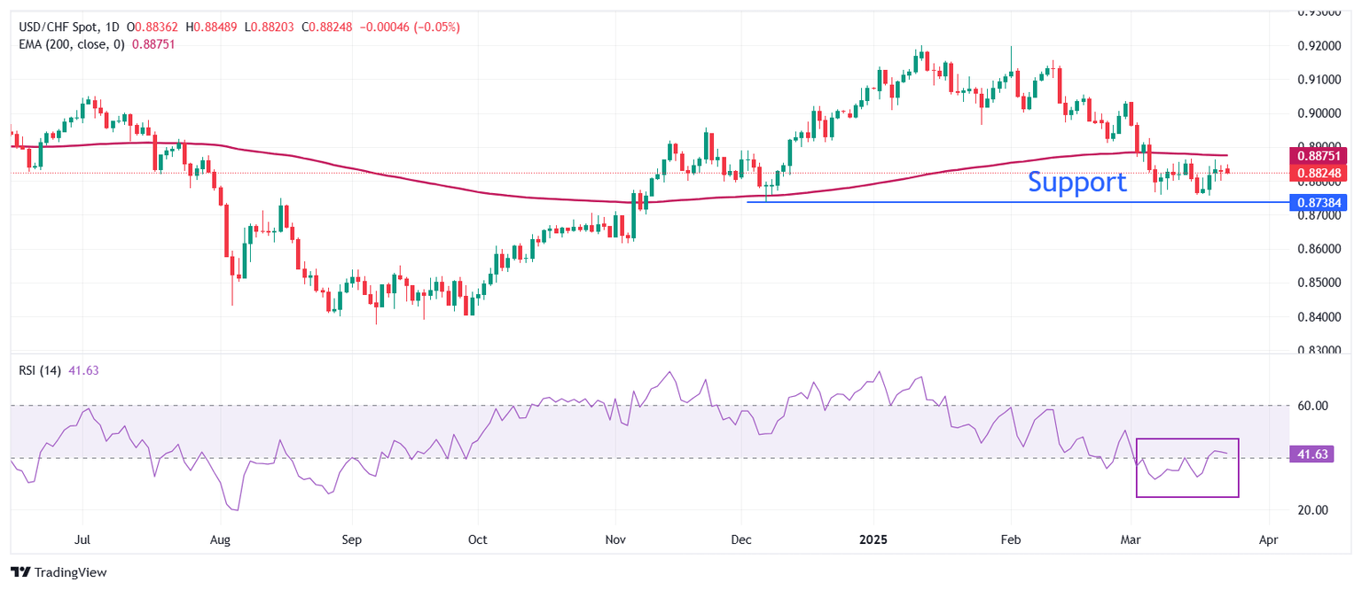 El par USD/CHF lucha por extender su alza por encima de la resistencia clave de 0.8850 durante las horas de negociación europeas del martes. El par Franco suizo baja mientras el Dólar estadounidense (USD) lucha por ganar más terreno, a pesar de que el presidente de Estados Unidos (EE.UU.) Donald Trump ha señalado que algunos países lograrían escapar de los aranceles, que está programado para revelar el 2 de abril. El Índice del Dólar estadounidense (DXY), que sigue el valor del Dólar frente a seis monedas principales, enfrenta presión mientras extiende una racha ganadora de cuatro días por encima de 104.50