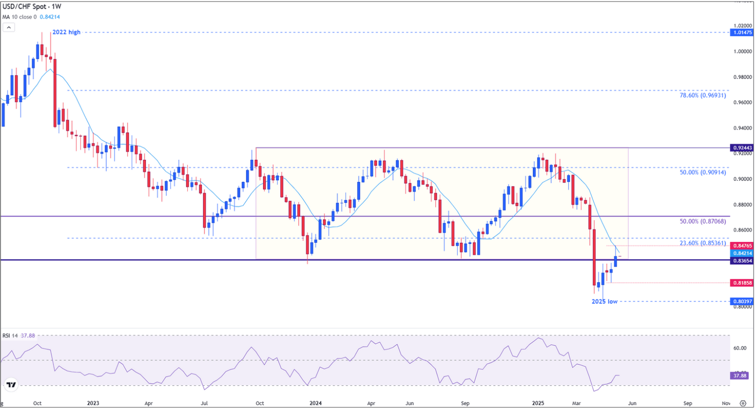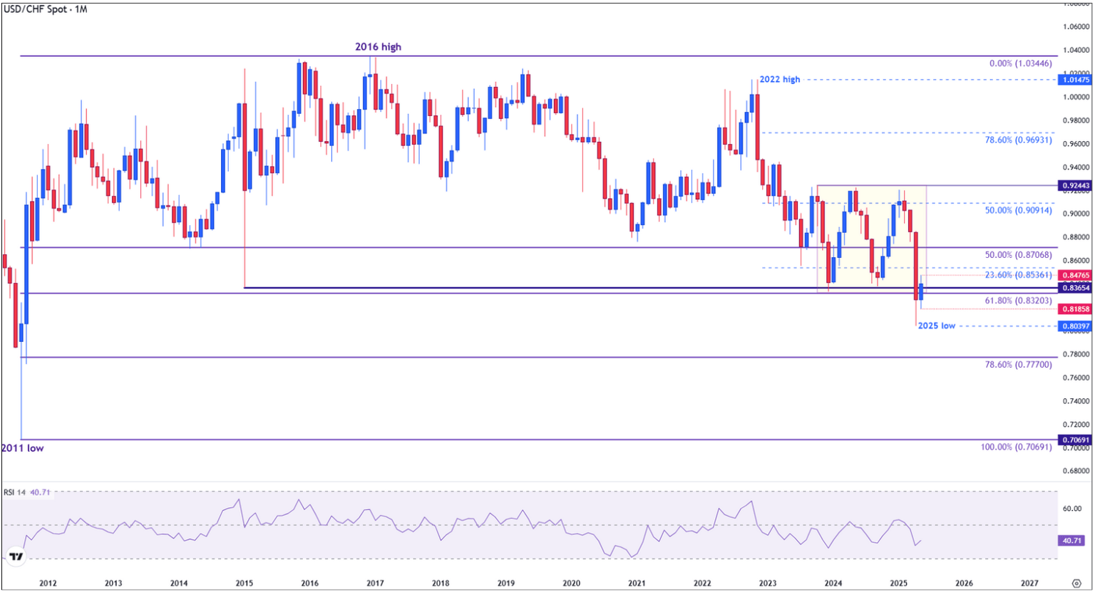 El USD/CHF encontró un fuerte soporte el 21 de abril cerca de 0.8040 —su nivel más bajo desde 2015— y desde entonces ha comenzado a recuperarse. Este rebote se produjo justo por debajo de un nivel clave de retroceso de Fibonacci a largo plazo cerca de 0.8320, que históricamente ha actuado como un punto de inflexión importante para el par. Notablemente, esta misma zona ayudó a estabilizar los precios durante la consolidación de 2015–2016, añadiendo peso a su importancia como base estructural.