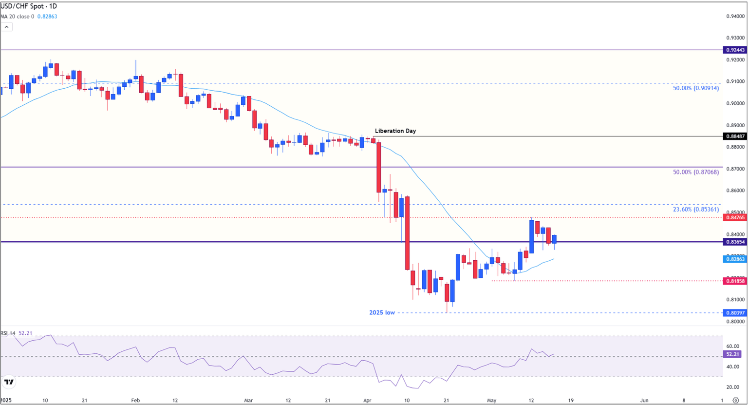 El gráfico diario muestra que el USD/CHF se está consolidando justo por debajo de la barrera de 0.8536 después de haber subido desde el mínimo de abril en 0.8039. La acción del precio sigue siendo respaldada por una SMA de 20 días en ascenso, actualmente en 0.8285, mientras que un patrón de mínimos más altos señala una demanda continua. Aún así, el impulso está disminuyendo, con el Índice de Fuerza Relativa (RSI) estabilizándose cerca de 51.2 – un indicador neutral que refleja un mercado equilibrado, pero indeciso.
