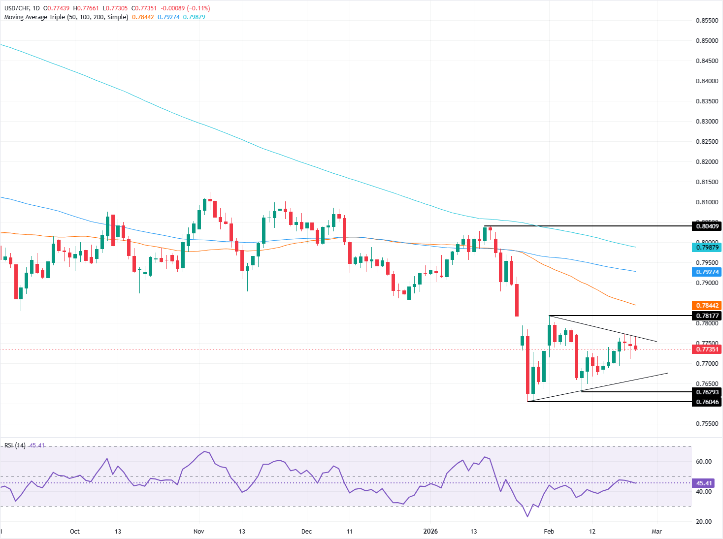 El USD/CHF baja durante la sesión norteamericana del martes, cayendo un 0.20%, a pesar de que el Dólar estadounidense (USD) registró sólidas ganancias frente a la mayoría de sus pares, excepto el Franco suizo (CHF). En el momento de escribir, el par cotiza a 0.7733 y prueba el soporte clave en la media móvil simple (SMA) de 20 días en 0.7723.