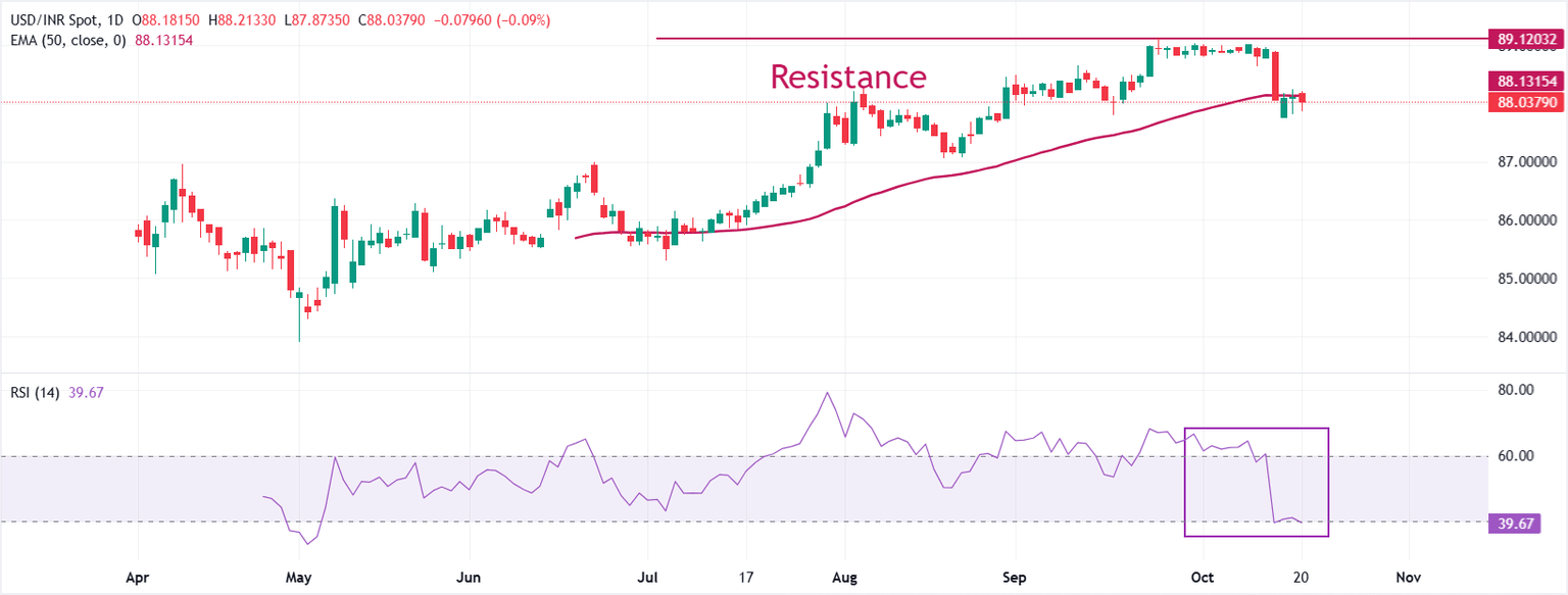 El USD/INR comenzó la semana con cautela, cayendo a cerca de 88.00. La media móvil exponencial (EMA) de 50 días cerca de 88.13 está actuando como una barrera clave para los alcistas del USD/INR.