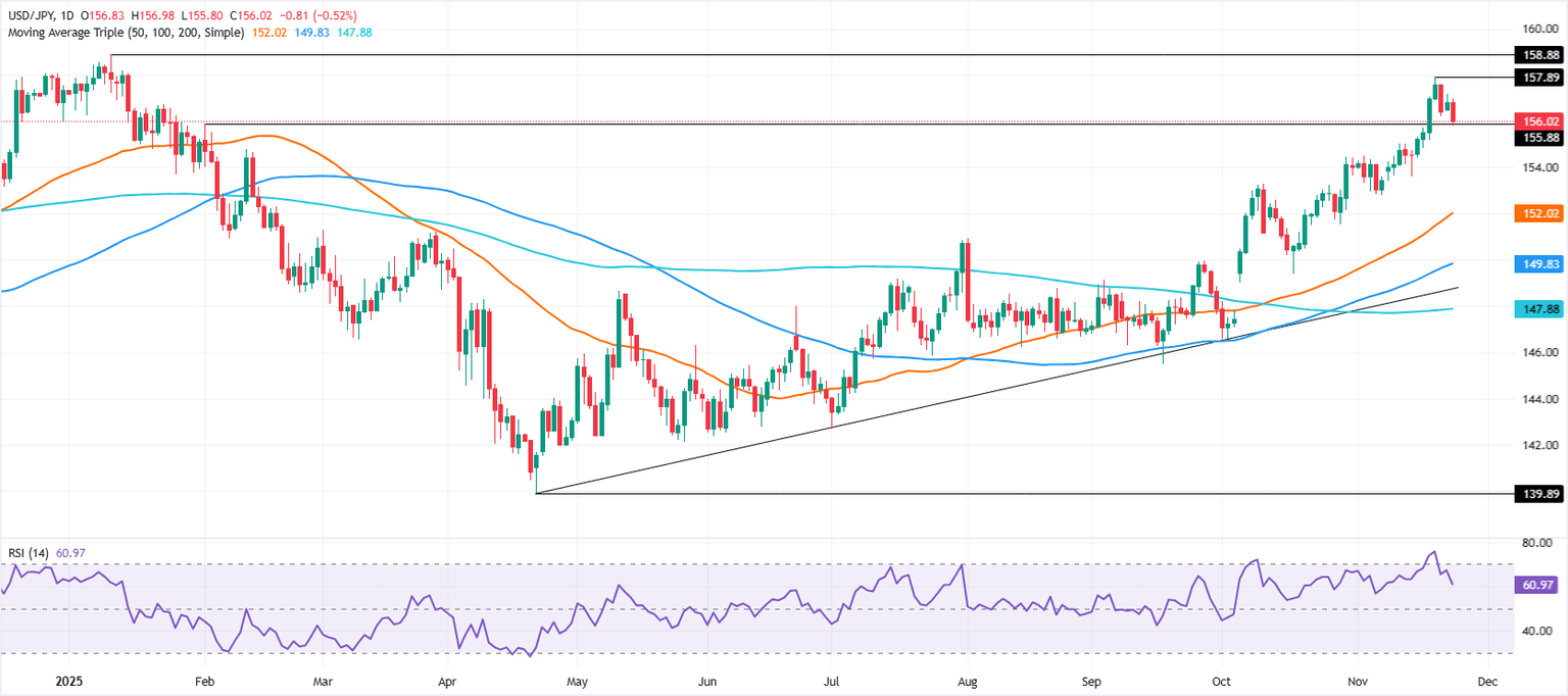 El USD/JPY da un giro en U y cae más de un 0.54% el martes, ya que los inversores se mostraron confiados en que la Reserva Federal recortará las tasas en la reunión de diciembre, tras un informe de inflación débil en EE.UU., junto con ventas minoristas más bajas de lo esperado. En el momento de escribir, el par cotiza a 155.98, por debajo de la cifra de 156.00 por primera vez en cuatro días.