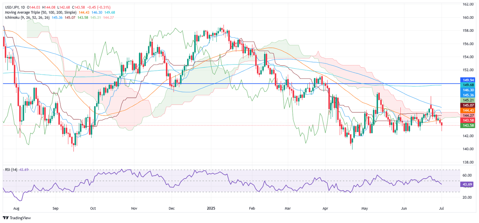 - El soporte clave se encuentra en 143.00 y 142.11; la resistencia está limitada cerca de la zona de la nube de Ichimoku de 144.50–145.35.