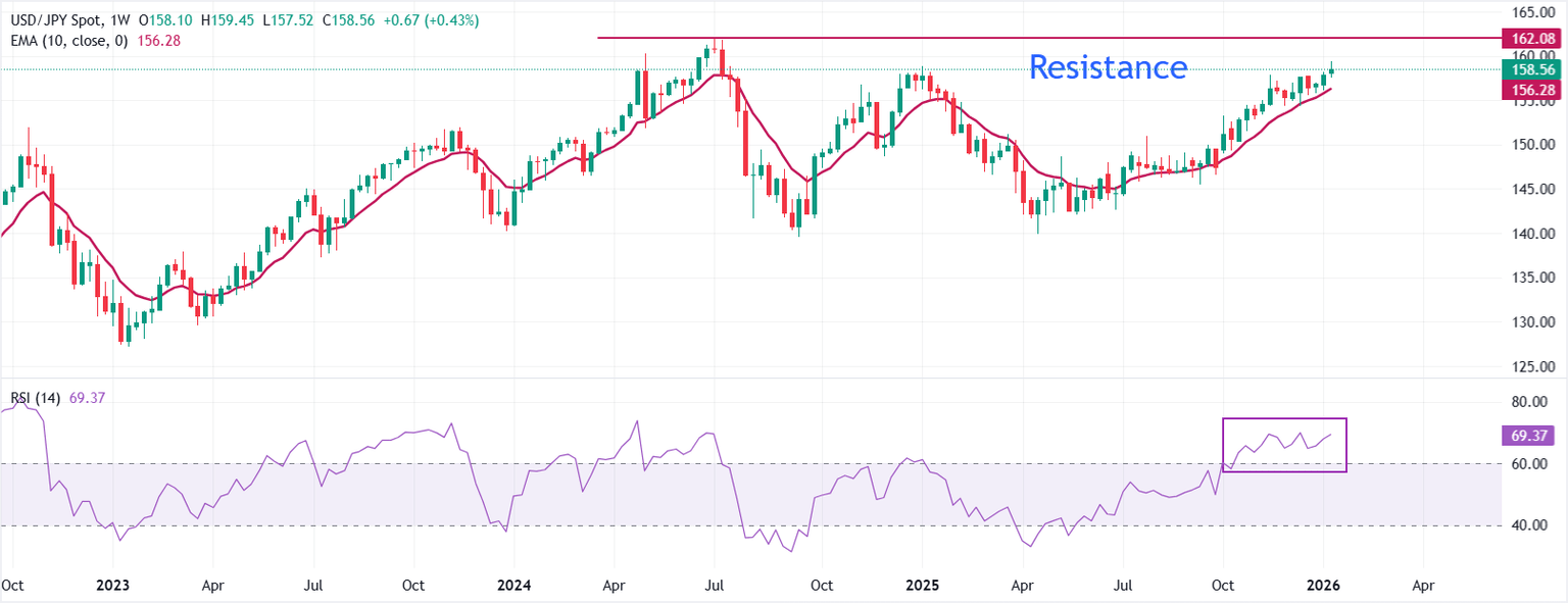 El USD/JPY cotiza casi plano alrededor de 158.56 durante el momento de la publicación. El precio se mantiene bien por encima de la media móvil exponencial (EMA) de 10 semanas en ascenso, reforzando una fuerte tendencia alcista. La subida constante de la EMA de 10 semanas apoya las caídas y mantiene la presión en la parte superior.