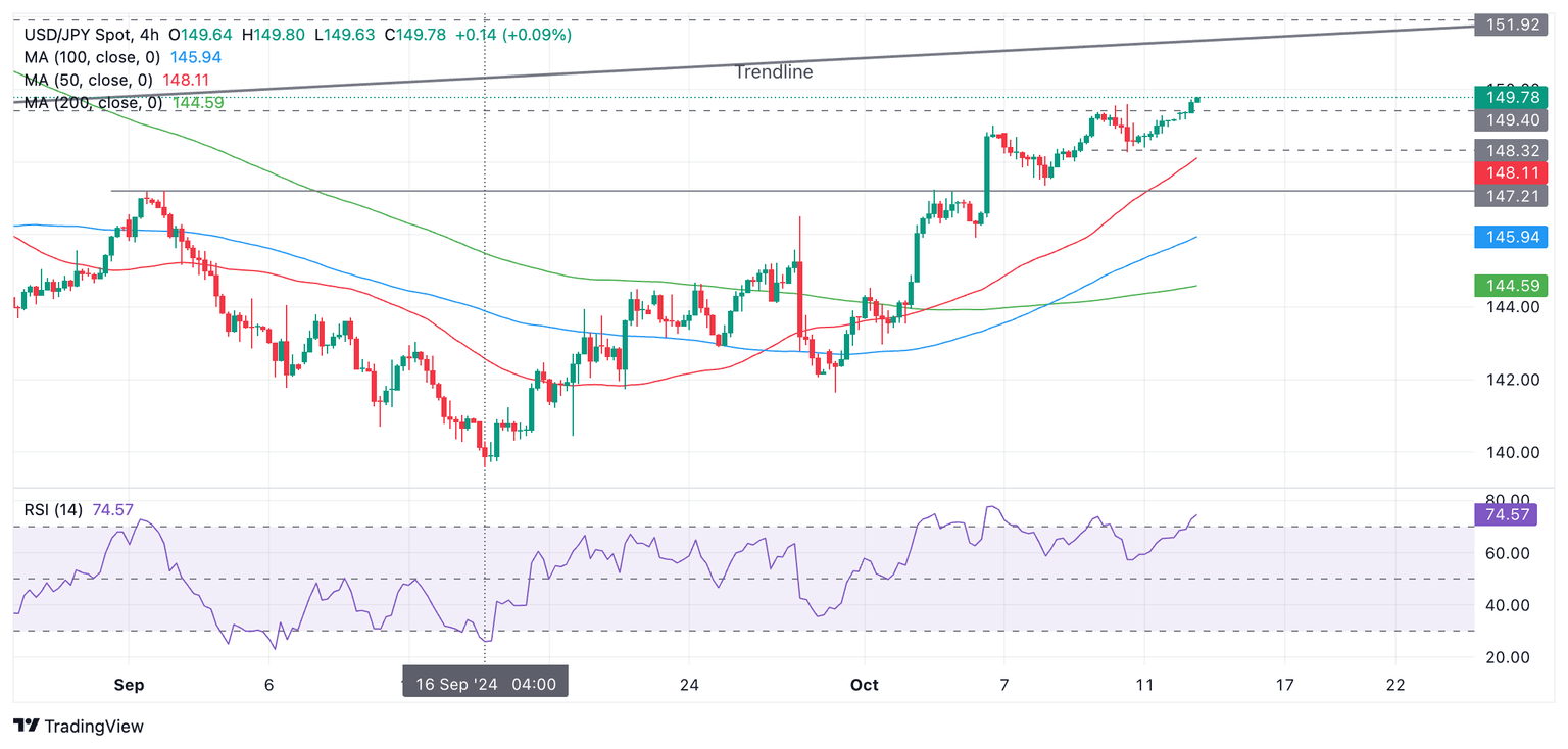 El USD/JPY ha estado subiendo constantemente desde los mínimos de 140.00 a mediados de septiembre. Ahora está en los 149.00 y parece haber establecido una tendencia alcista a corto y probablemente mediano plazo. Dada la premisa de que "la tendencia es tu amiga", las probabilidades favorecen una continuación al alza.