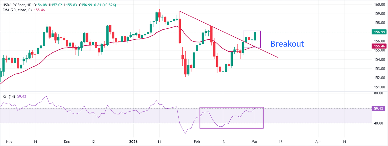 El USD/JPY cotiza notablemente más alto alrededor de 157.00 en el tiempo de prensa. El par ha extendido su rebote por encima de la línea de resistencia descendente rota, trazada desde el máximo del 23 de enero de 159.26, cambiando la tendencia a corto plazo a moderadamente alcista, ya que el precio se mantiene bien por encima de la media móvil exponencial (EMA) de 20 días cerca de 155.50. El reciente cierre por encima de la EMA de 20 días confirma una recuperación en la demanda subyacente después de la caída del mes pasado, mientras que el Índice de Fuerza Relativa (RSI) de 14 días que sube hacia 60 señala un fortalecimiento del impulso alcista en lugar de agotamiento en los niveles actuales.