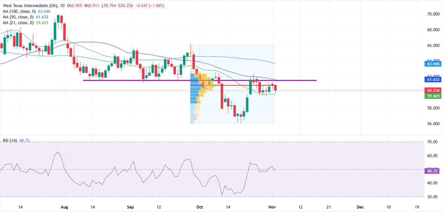 Mientras tanto, el Perfil de Volumen de Rango Fijo muestra la mayor actividad comercial agrupada entre 60.00$ y 62.50$, sugiriendo un fuerte suministro en esa región. El Índice de Fuerza Relativa (RSI) se sitúa cerca de 47, reflejando un impulso neutral a bajista.