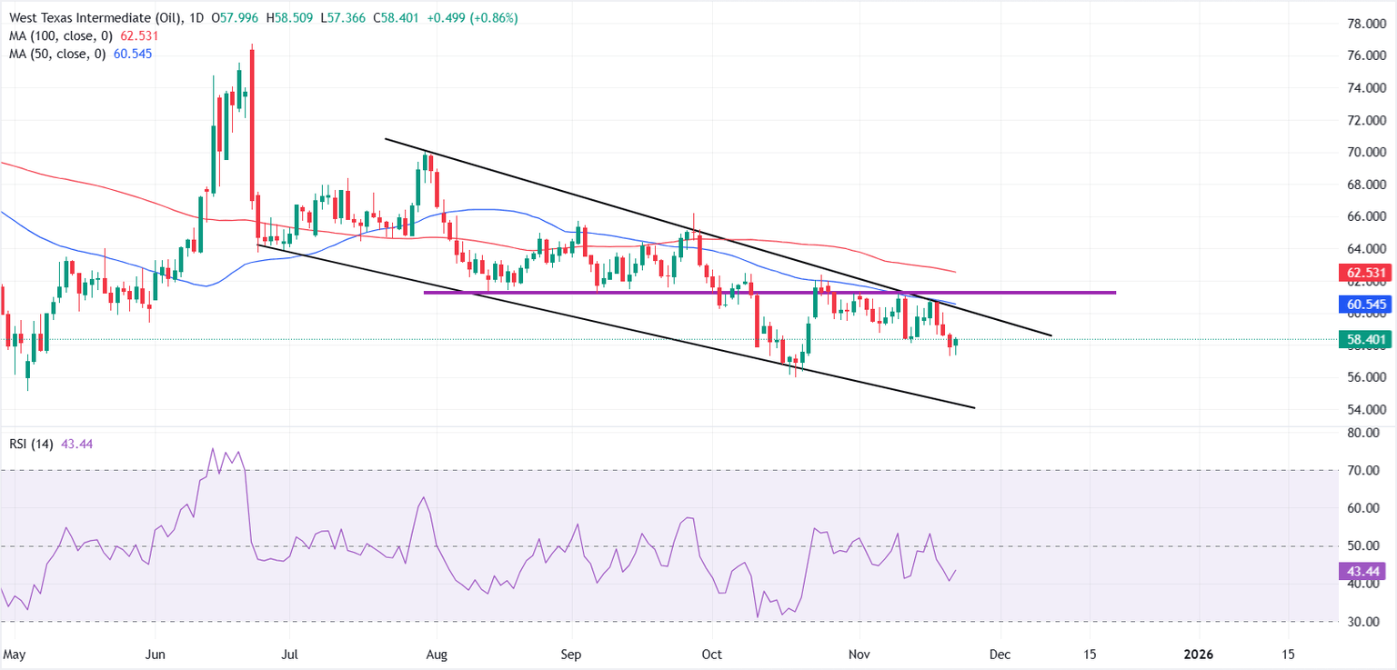 El petróleo crudo West Texas Intermediate (WTI) está intentando un modesto rebote el lunes, rompiendo una racha de tres días de pérdidas mientras los operadores equilibran las expectativas renovadas de recortes de tasas de interés de la Reserva Federal (Fed) en diciembre con los desarrollos en las conversaciones de paz entre Rusia y Ucrania. En el momento de escribir, el WTI se cotiza alrededor de 58.40$, recuperándose de mínimos de casi un mes alrededor de 57.33$.