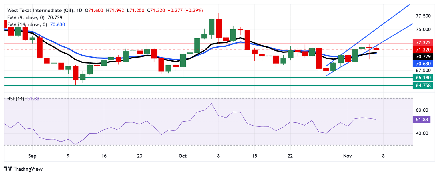 - El precio del WTI podría encontrar soporte inmediato en la EMA de nueve días en 70,72 $, alineado con la EMA de 14 días en 70,62 $.