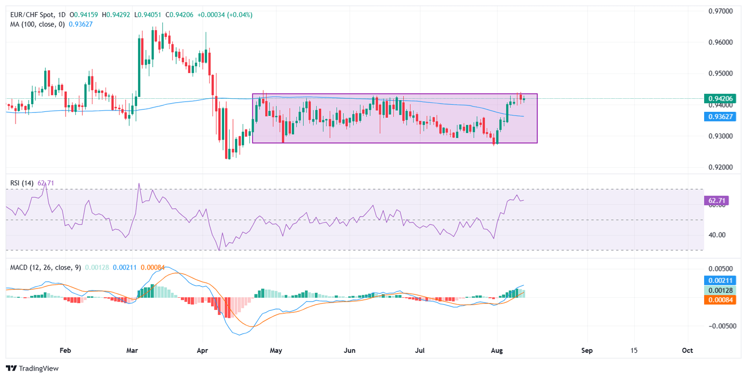 - El EUR/CHF se mantiene estable por encima de 0.9400, consolidando ganancias recientes tras rebotar desde el límite inferior de un rango de varios meses alrededor de 0.9300.