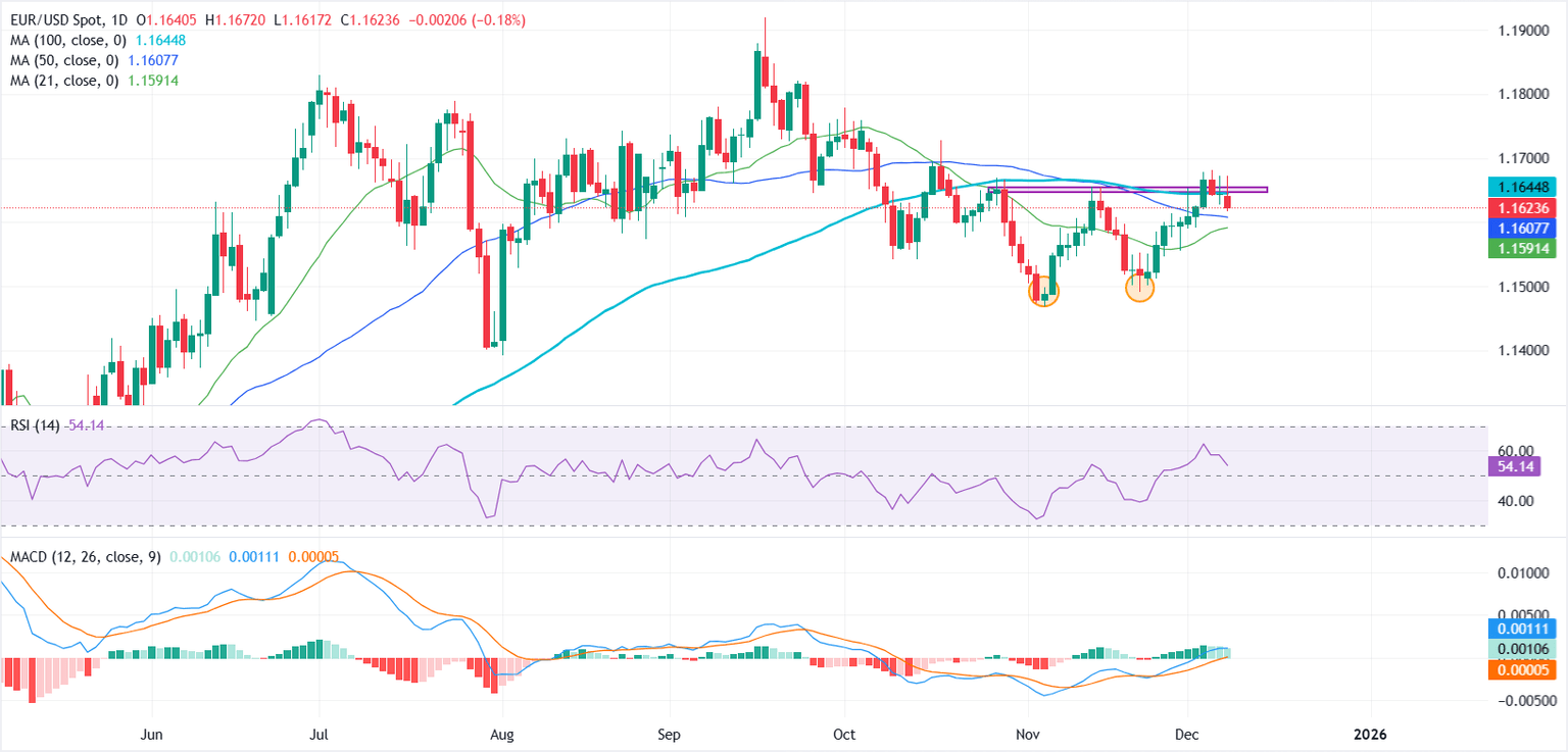 Un cierre decisivo por encima de esta región reforzaría el impulso alcista y abriría la puerta hacia 1.1700 y 1.1750. A la baja, las SMAs de 21 y 50 días proporcionan soporte inmediato. Un comercio sostenido por encima de estas medias mantiene el sesgo constructivo a corto plazo, mientras que una ruptura por debajo de ellas expondría una nueva presión a la baja, potencialmente arrastrando al EUR/USD de regreso hacia 1.1500.
