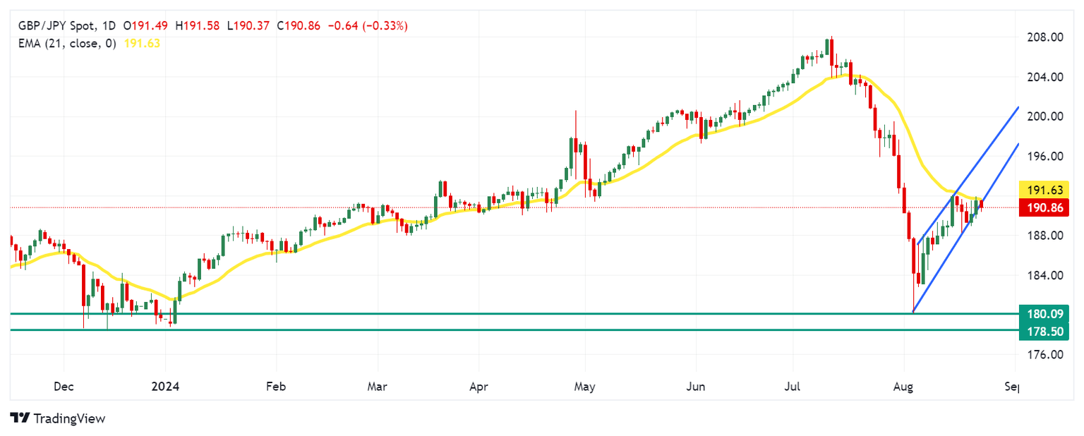- GBP/JPY puede encontrar resistencia inmediata alrededor de la EMA de 21 días en 191.63.