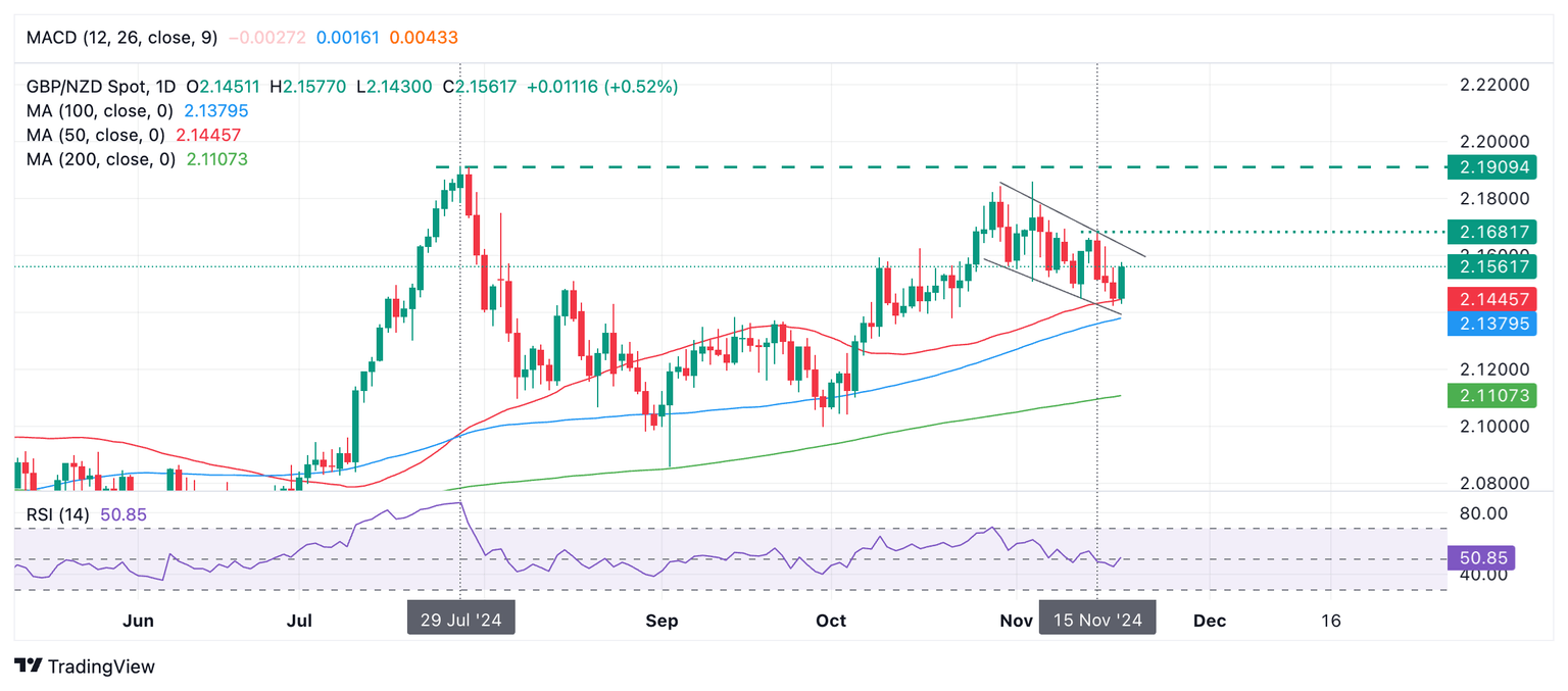 GBP/NZD ha estado corrigiendo en un mini canal durante noviembre después de alcanzar el máximo del 30 de octubre. Ahora ha alcanzado soporte en la Media Móvil Simple (SMA) de 50 días en 2.1446 y ha hecho una fuerte recuperación, evidenciada por la larga vela verde hasta ahora, el miércoles.