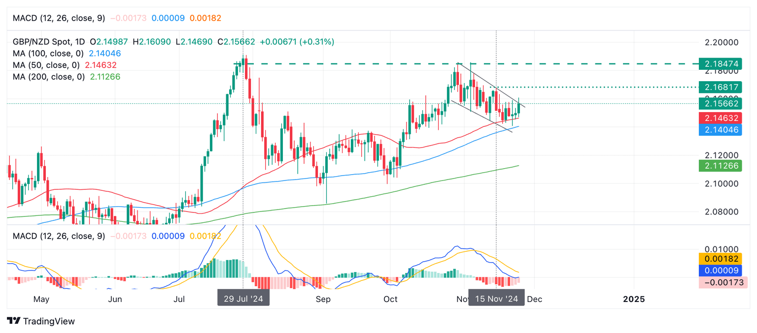 GBP/NZD prueba la línea superior de un canal en el que ha estado cayendo durante el mes de noviembre. Una ruptura exitosa del canal podría llevar a una extensión al alza hacia la resistencia en la zona media de los 2.1800.