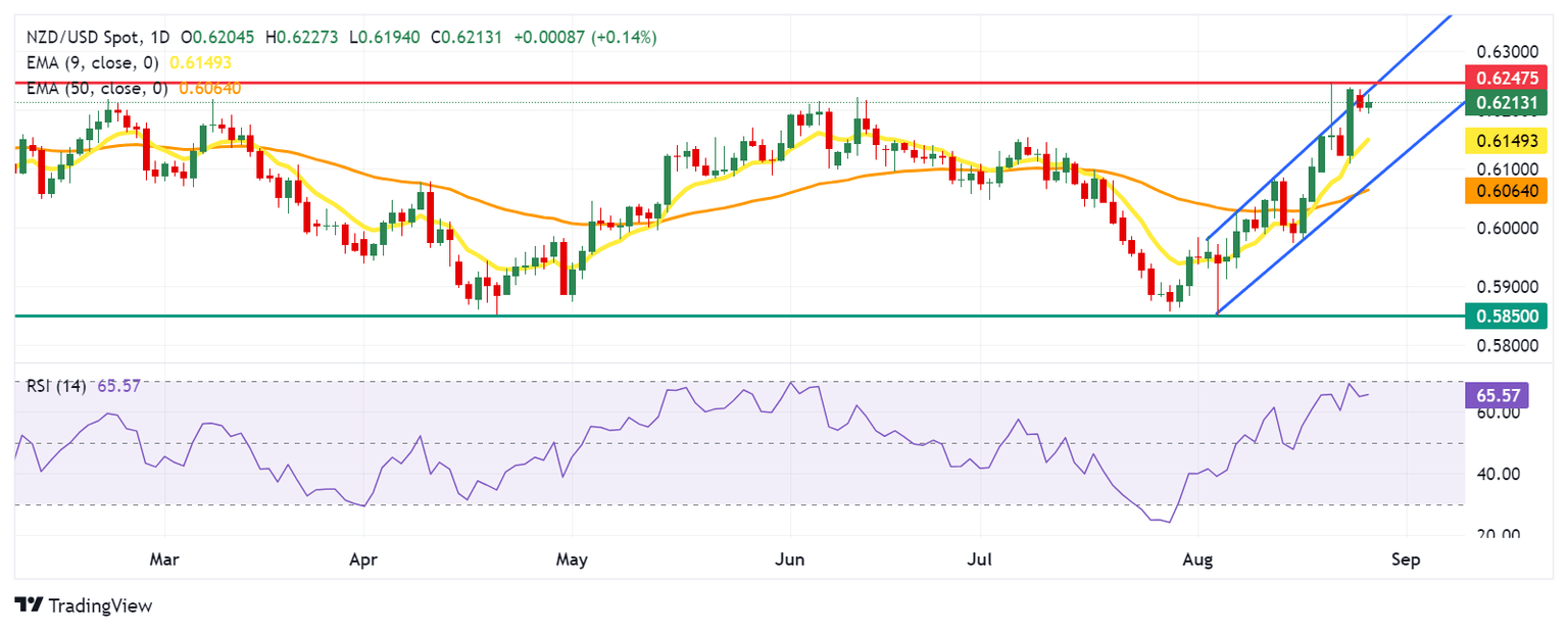 El NZD/USD recupera las pérdidas recientes de la sesión anterior, cotizando alrededor de 0.6220 durante las horas europeas del martes. En el gráfico diario, el par se mueve hacia arriba dentro del límite superior de un canal ascendente, apoyando una perspectiva alcista.