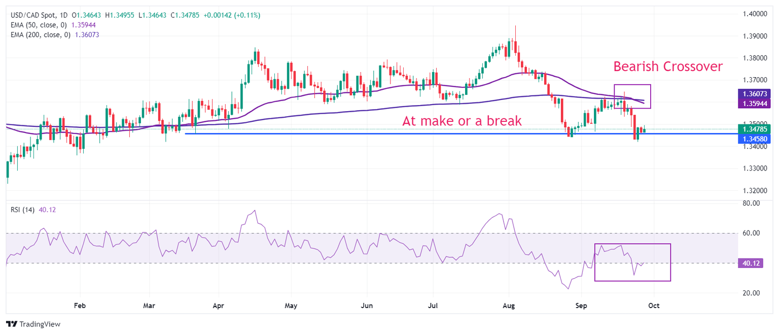 El USD/CAD cotiza en un punto decisivo por encima del soporte inmediato de 1.3400. El par formó un nuevo mínimo oscilante cerca de 1.3400 en un marco temporal diario, lo que sugiere una tendencia bajista. Un cruce bajista, representado por las medias móviles exponenciales (EMAs) de 20 y 50 días cerca de 1.3600, indica más caídas por delante.
