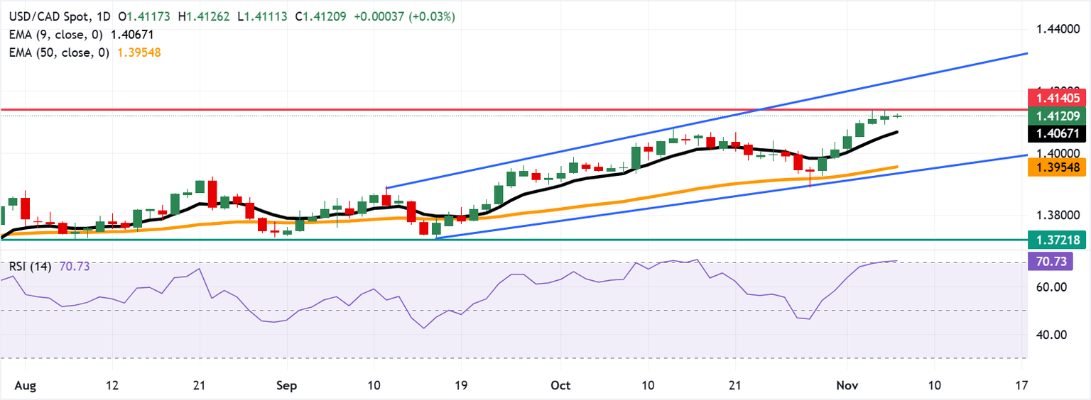 El USD/CAD continúa su racha de ganancias por séptimo día consecutivo, cotizando alrededor de 1.4120 durante las horas europeas del viernes. El análisis técnico del gráfico diario indica un sesgo alcista predominante, con el par permaneciendo dentro del patrón de canal ascendente.