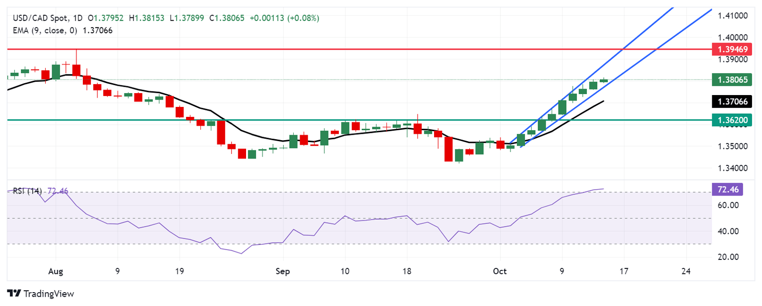El USD/CAD continúa su impulso alcista, extendiendo el rally que comenzó el 2 de octubre, cotizando cerca de 1.3810 durante las primeras horas de la sesión europea del martes. El gráfico diario muestra que el par está en tendencia alcista dentro de un canal ascendente, reforzando una perspectiva alcista.