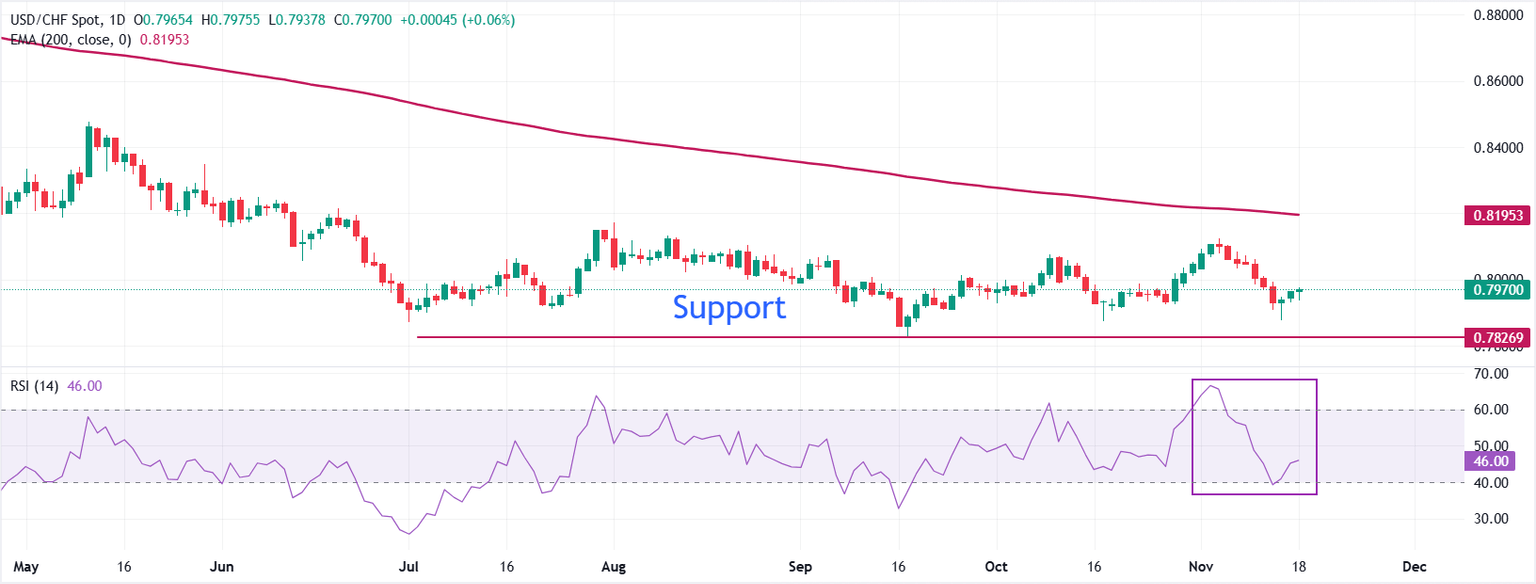 El USD/CHF se mantiene por debajo de la Media Móvil Exponencial (EMA) de 200 días, que cotiza alrededor de 0.8195, lo que sugiere que la tendencia general es bajista.