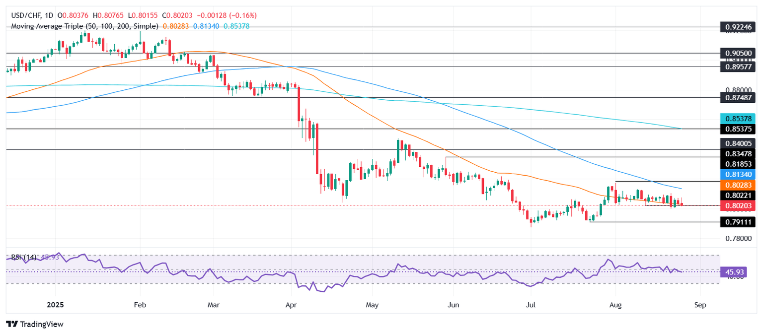 A la baja, una nueva prueba de 0.8000—el reciente mínimo más bajo del 28 de julio—sigue siendo posible. Una caída por debajo apuntaría a 0.7944 del 28 de julio, luego al mínimo del ciclo del 23 de julio en 0.7911. Por el contrario, un movimiento por encima de 0.8075 podría allanar el camino hacia 0.8100, con la SMA de 100 días en 0.8139 actuando como la siguiente resistencia clave.