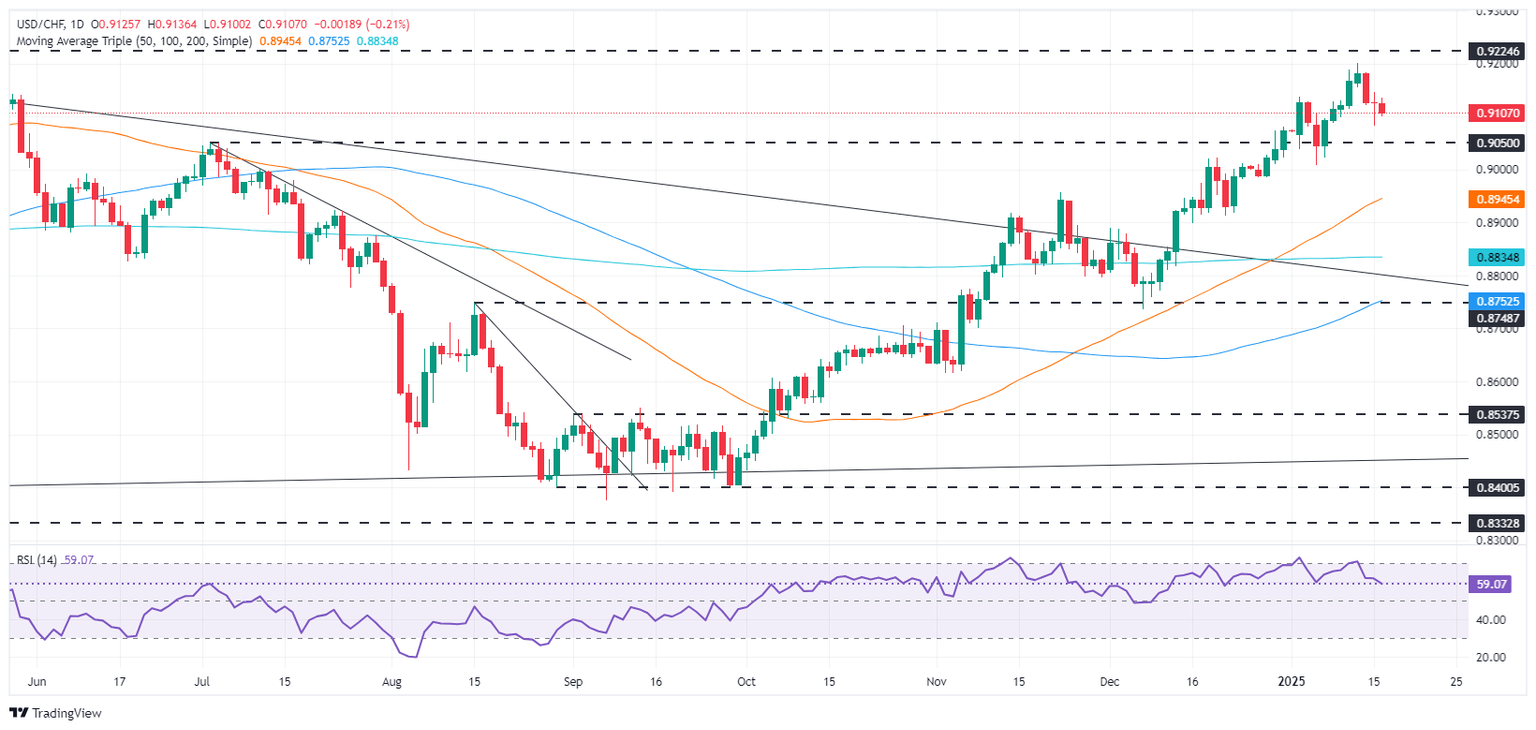 El USD/CHF retrocede después de alcanzar un pico de ocho meses en 0.9200 y cae hacia la marca de 0.9100, registrando pérdidas de más del 0.18%. Los datos optimistas de Estados Unidos (EE.UU.) no lograron impulsar al Dólar, que extendió sus pérdidas tras los comentarios moderados del Gobernador de la Fed, Christopher Waller.