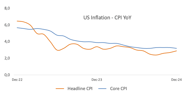 Se espera que la inflación en EE.UU., medida por el Índice de Precios al Consumo (IPC), aumente un 2.9% anual en diciembre, ligeramente por encima del 2.7% de noviembre. Se proyecta que la inflación subyacente del IPC, que excluye las categorías más volátiles de alimentos y energía, se mantenga estable en el 3.3% respecto al año anterior.