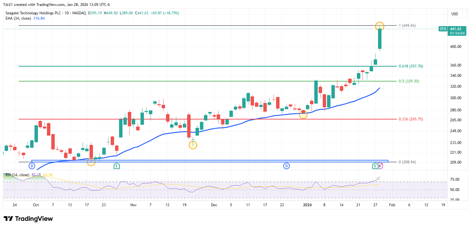 En este contexto, STX repunta un 18.64% en el día, subiendo 70.66 dólares, estableciendo un nuevo máximo histórico en 449.50$, liderando las ganancias en el índice tecnológico Nasdaq 100.