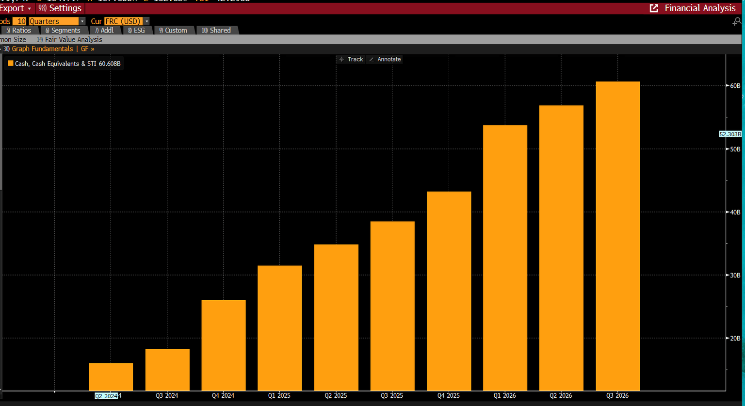 Esta empresa es una máquina de generar efectivo: cuenta con 60.600 millones de dólares en efectivo y equivalentes en su balance, frente a los 38.400 millones de dólares del año anterior. Para ponerlo en perspectiva, Apple tiene 54.690 millones de dólares en efectivo y equivalentes en su balance. Sin embargo, para Nvidia, lo más importante es la cantidad de efectivo que Microsoft tiene en su balance. El trimestre pasado, Microsoft reportó más de 102.000 millones de dólares en efectivo y equivalentes, lo que sugiere que el mayor cliente de Nvidia puede permitirse sin problemas un programa de desarrollo de IA a largo plazo.