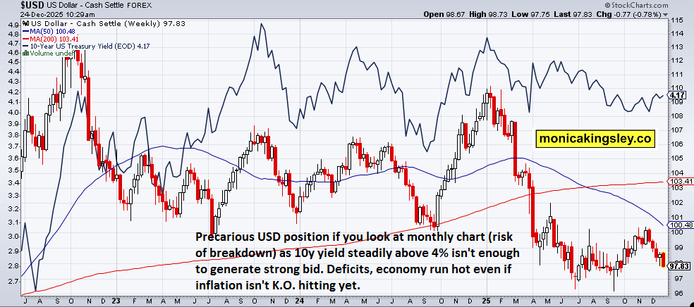 Hasta fin de año, lo tenía claro: se trata de una entrada larga favorable en términos de riesgo-recompensa, con el ES liderando frente al NDX rezagado (esa fue la esencia del pronóstico rentable del lunes, y como el Nasdaq tenía un potencial alcista comparativamente más limitado que el SPX de ayer, tampoco estaba promocionando tecnología). En este sentido, ver a NVDA subir un 3%, con AVGO, GOOGL, AMZN (y ORCL no tardarán en dar un giro), es muy alentador; TSLA no se quedará atrás, gracias a la robótica. El oro y la plata también están generando ganancias para los operadores, como se anunció, por lo que advertí a los inversores en corto sobre petróleo que se mantuvieran alerta.