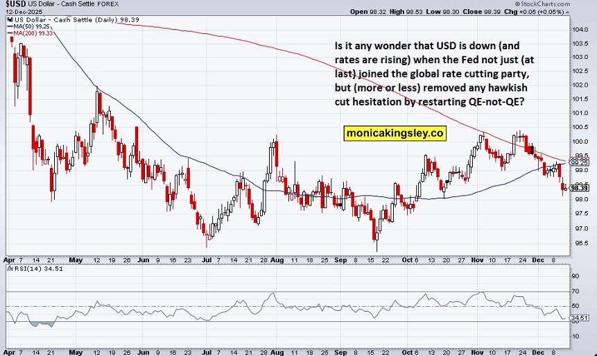 El primer repunte intradía serio no llevó al ES a los 5.860 si no a los 5.870 – los toros no tuvieron iniciativa diaria. ¿Justificado? ¿Estaba el mercado de bonos y la volatilidad en llamas? Bueno, el USD se está debilitando debidamente por los recortes de tasas y esos 40.000 millones de dólares al mes, y el aumento de los rendimientos refleja la disminución de la atractividad de los bonos del Tesoro, lo que suma un entorno donde las acciones extranjeras se desempeñan mejor que las acciones estadounidenses.