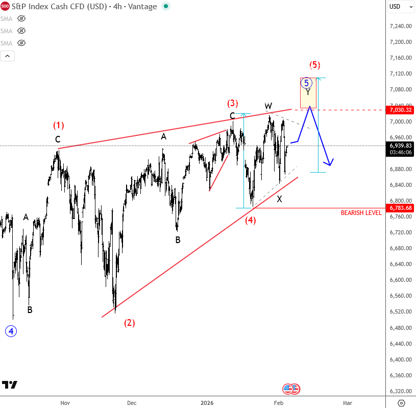 El S&P 500 se movió muy bien al alza desde los mínimos de noviembre y recientemente alcanzó nuevos máximos históricos antes de retroceder ligeramente en las últimas sesiones. Este retroceso plantea la pregunta de si el índice ya está enfrentando una resistencia más seria aquí arriba, especialmente ya que estamos viendo una acción de precios superpuesta, que parece un diagonal final. Puede ser demasiado pronto para llamar a un máximo, pero es importante estar consciente de una posible reversión FUERTE en las próximas semanas, que es a menudo el caso una vez que se completa un diagonal final. Al observar el último movimiento de precios con más detalle, parece que la ola (5) ya está aquí, pero puede volver a probar la línea superior una vez más, cerca de 7050. Una caída por debajo de 6783 sería muy bajista.