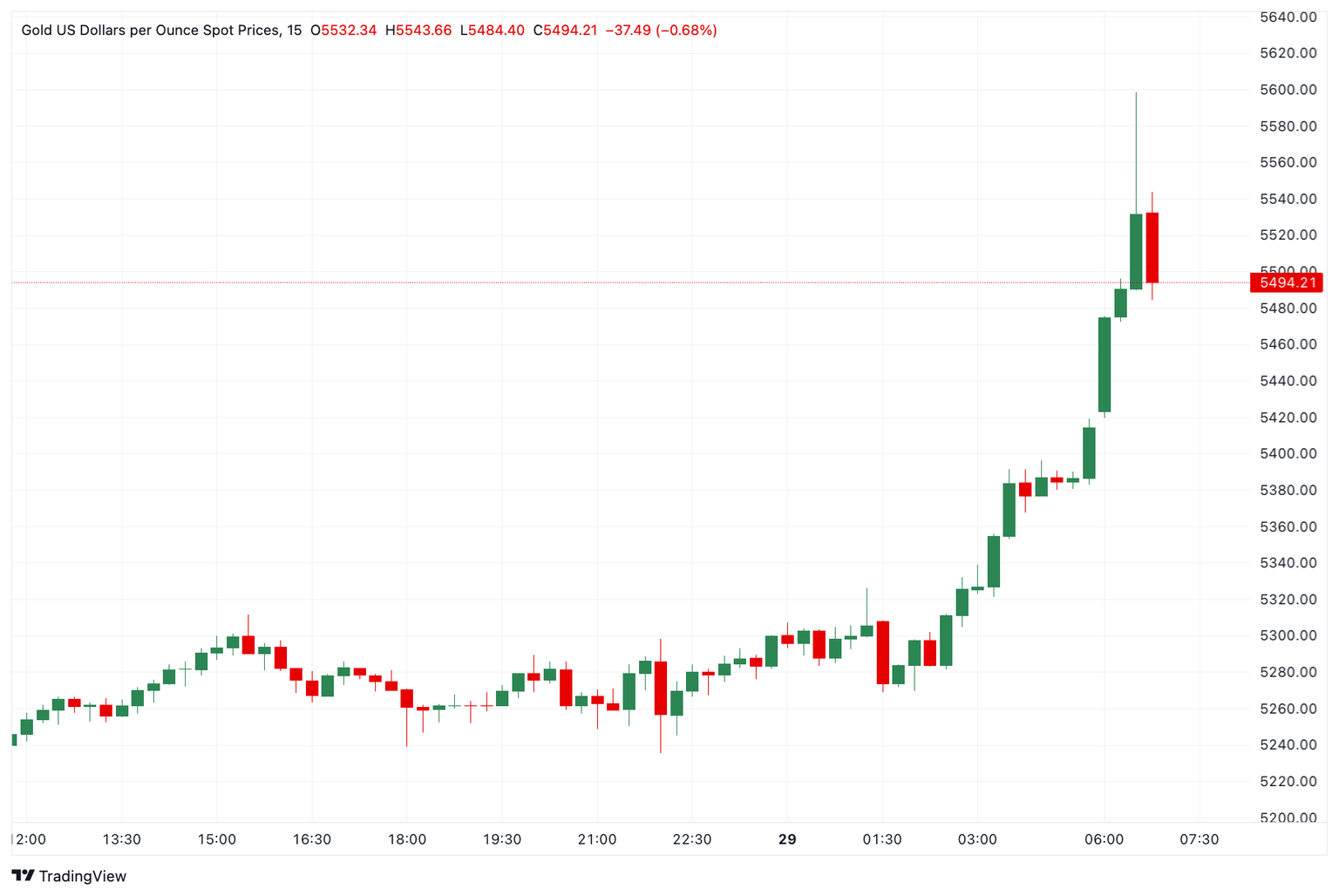 El precio del Oro (XAU/USD) se dispara a un nuevo máximo histórico de 5.579$ antes de retroceder a alrededor de 5.500$ en las primeras operaciones asiáticas del jueves. El rally del metal precioso se ve respaldado por una fuerte demanda de refugio seguro en medio de tensiones geopolíticas persistentes, incertidumbre económica y un Dólar estadounidense (USD) más débil.