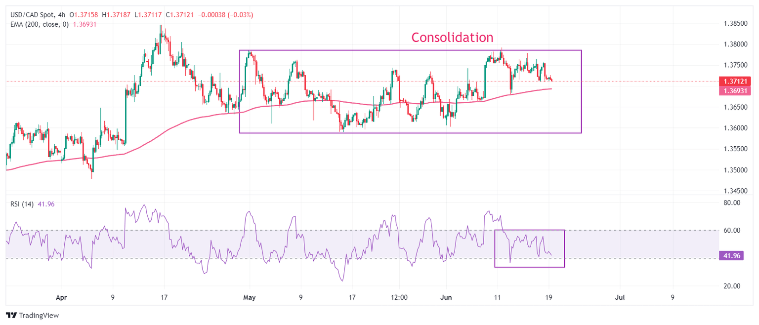 El USD/CAD continúa consolidándose en el rango de 1.3600-1.3800 desde hace casi siete semanas. El par mantiene la media móvil exponencial (EMA) de 200 días, que cotiza alrededor de 1.3690, lo que sugiere que la tendencia general es alcista.