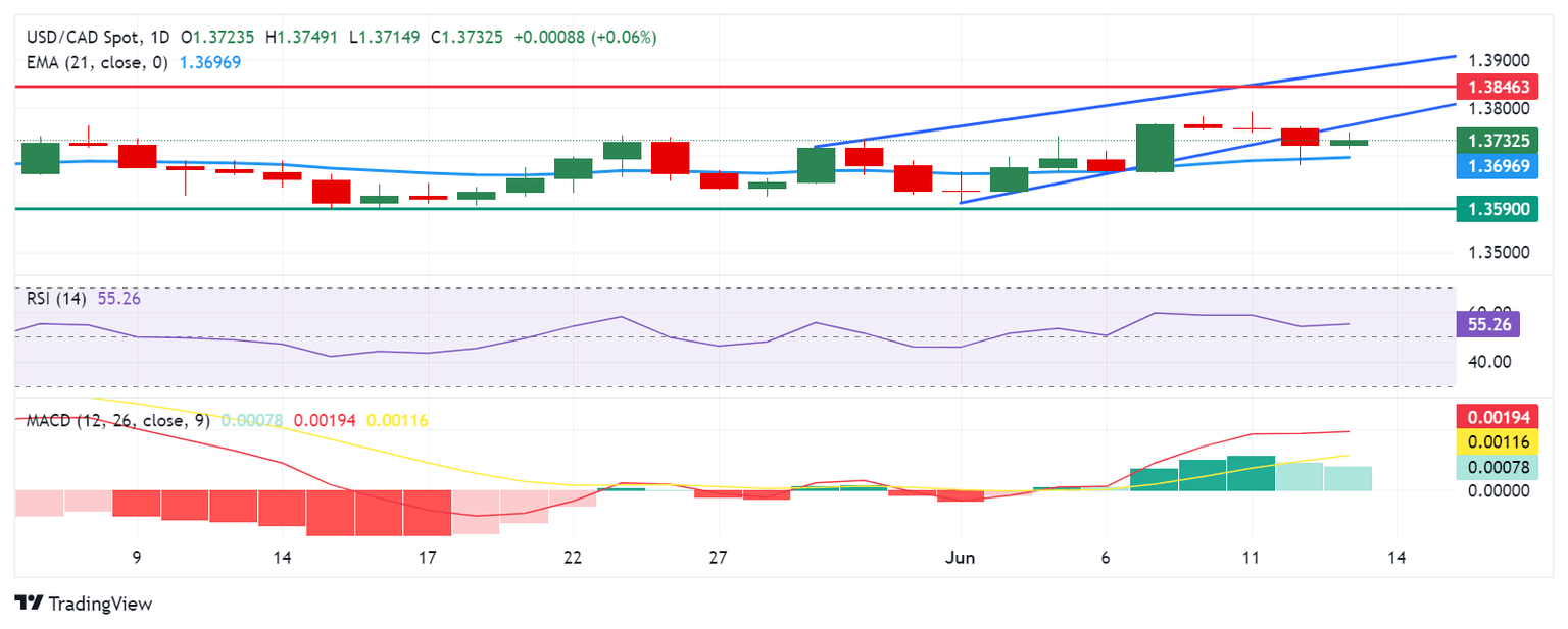 USD/CAD Análisis del Precio: Sube hasta cerca de 1.3750, se aproxima al límite inferior del canal ascendente