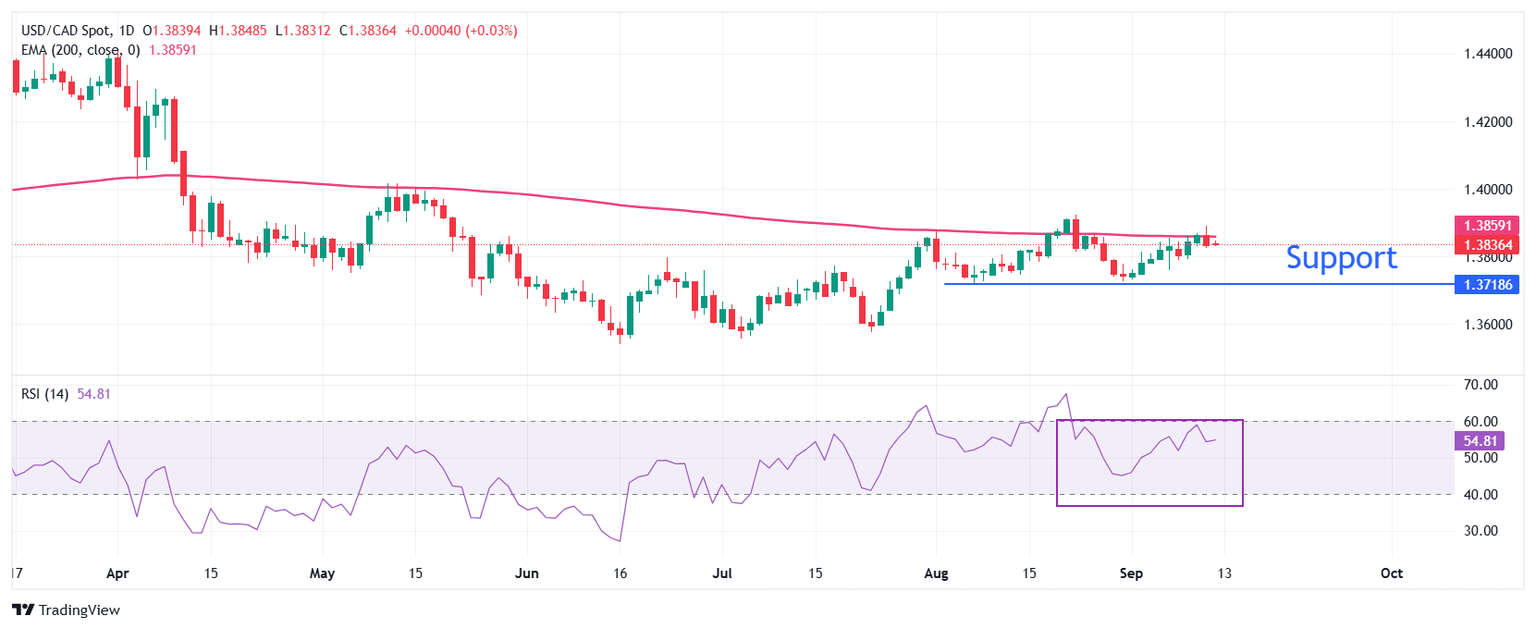 El USD/CAD continúa enfrentando presión por encima de la Media Móvil Exponencial (EMA) de 200 días, que cotiza alrededor de 1.3847.