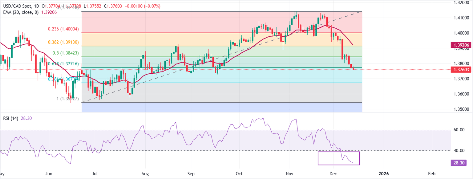 El USD/CAD cotiza a la baja en 1.3760 el viernes. El par se sitúa por debajo de la media móvil exponencial (EMA) de 20 días descendente en 1.3921, manteniendo el sesgo bajista a corto plazo y limitando los rebotes.