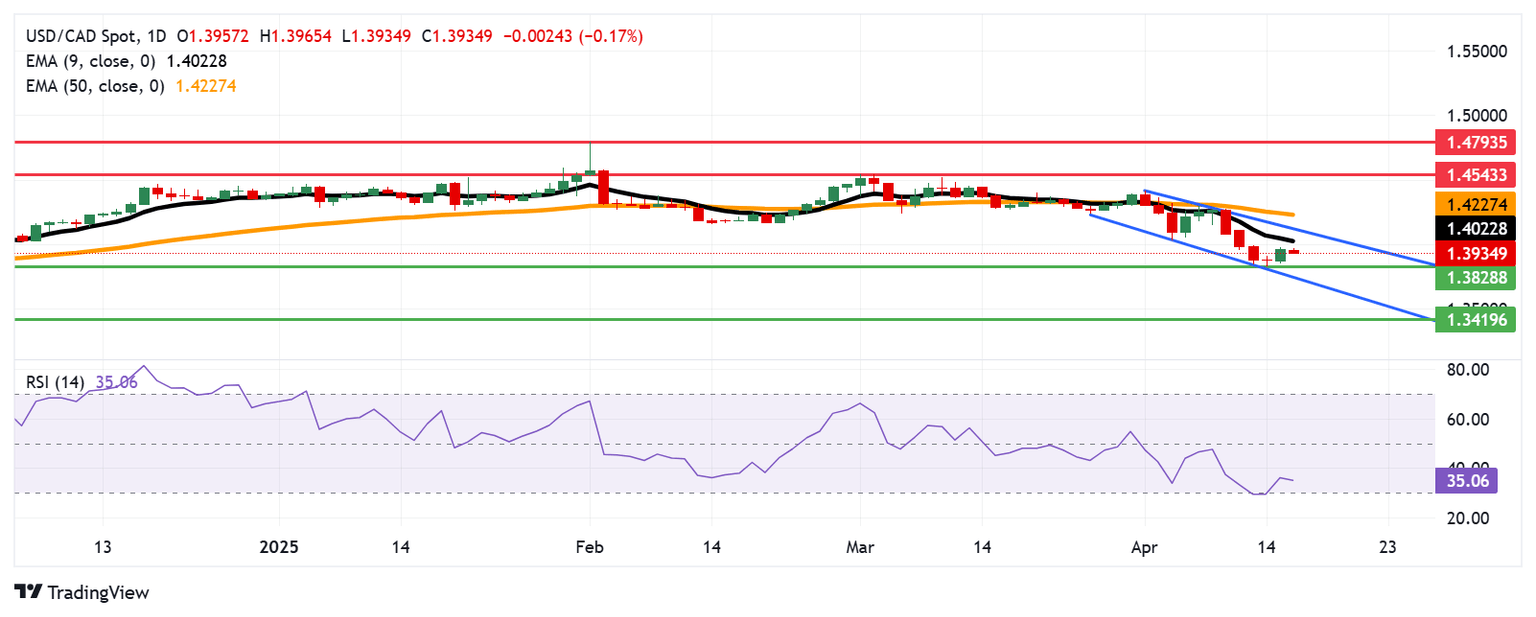 El par USD/CAD se desliza ligeramente después de registrar ganancias en la sesión anterior, cotizando cerca de 1.3940 durante la sesión asiática del miércoles. El análisis técnico en el gráfico diario indica una tendencia bajista predominante, ya que el par continúa moviéndose a la baja dentro de un canal descendente.