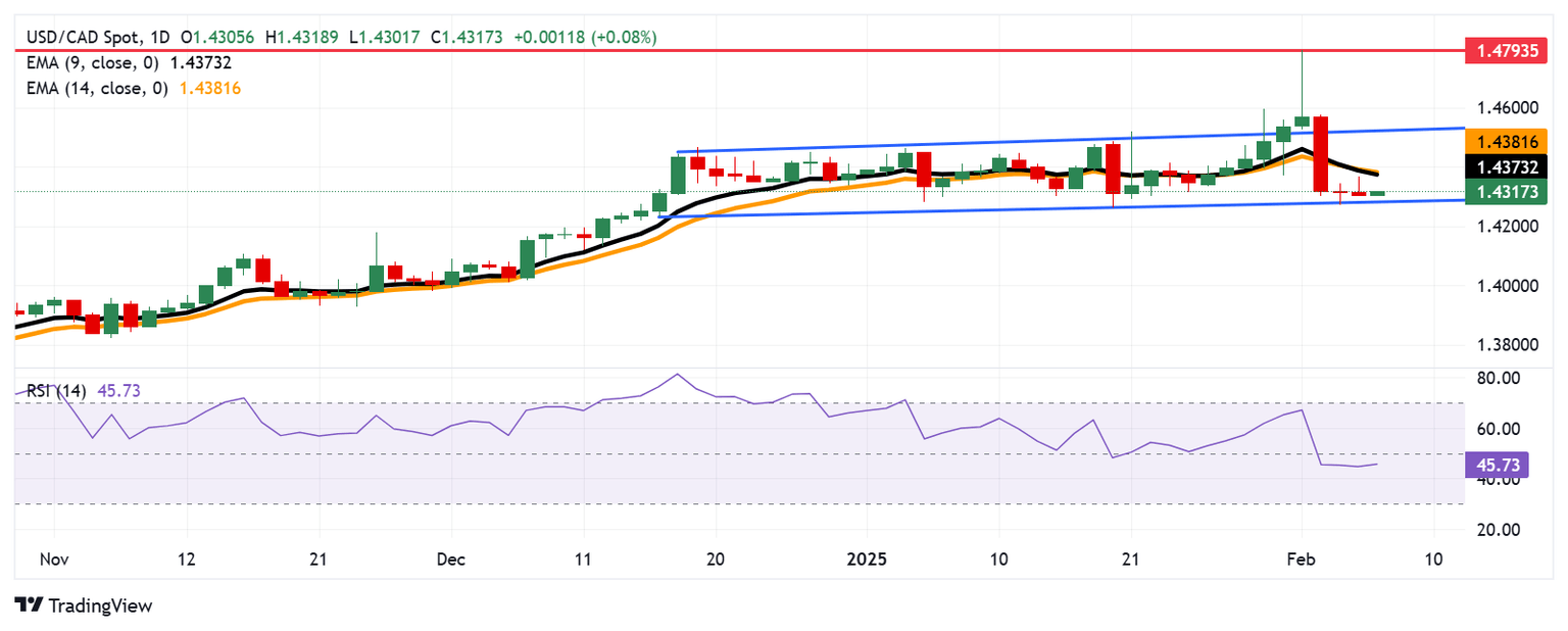 El par USD/CAD podría encontrar su resistencia inicial en la EMA de nueve días en el nivel de 1.4372, seguido por la EMA de 14 días en el nivel de 1.4381. Una ruptura por encima de estos niveles mejoraría el impulso de precio a corto plazo y apoyaría al par para probar el umbral superior del rectángulo en el nivel de 1.4530.